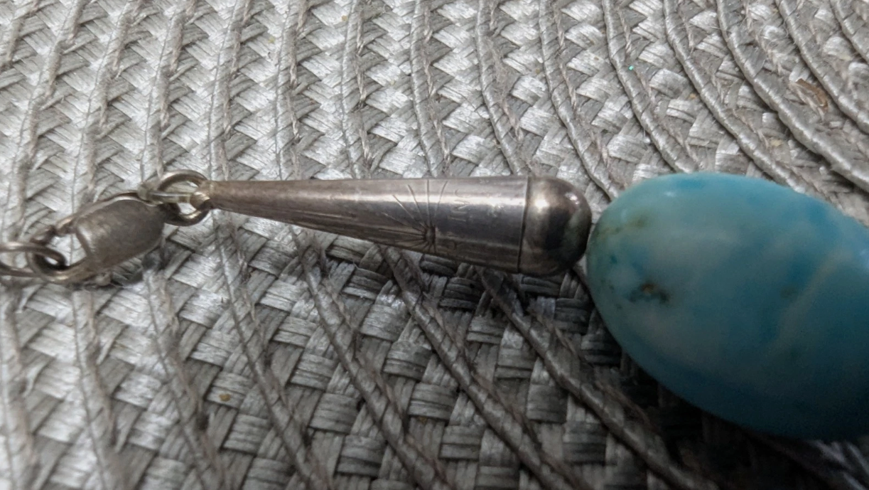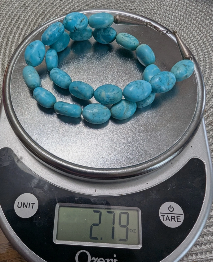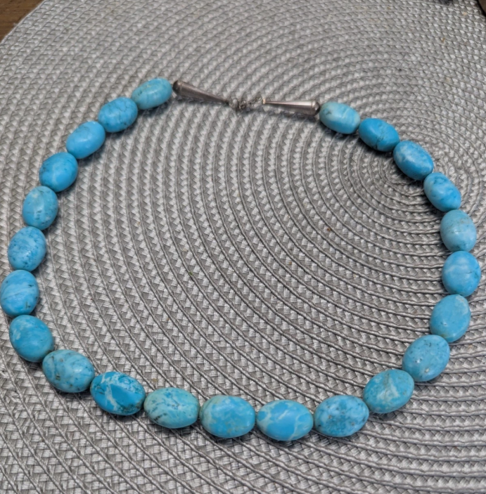 This Turquoise Beaded Native American Necklace features turquoise nugget stones with sterling silver hook closure with eye or sunrise signature mark, making it a unique and culturally-inspired accessory. The beaded design and use of native materials give it an authentic and traditional look, perfect for anyone interested in ethnic and tribal jewelry. The turquoise and silver color combination adds a touch of elegance to this unisex necklace, making it a versatile and stylish piece to add to any ...